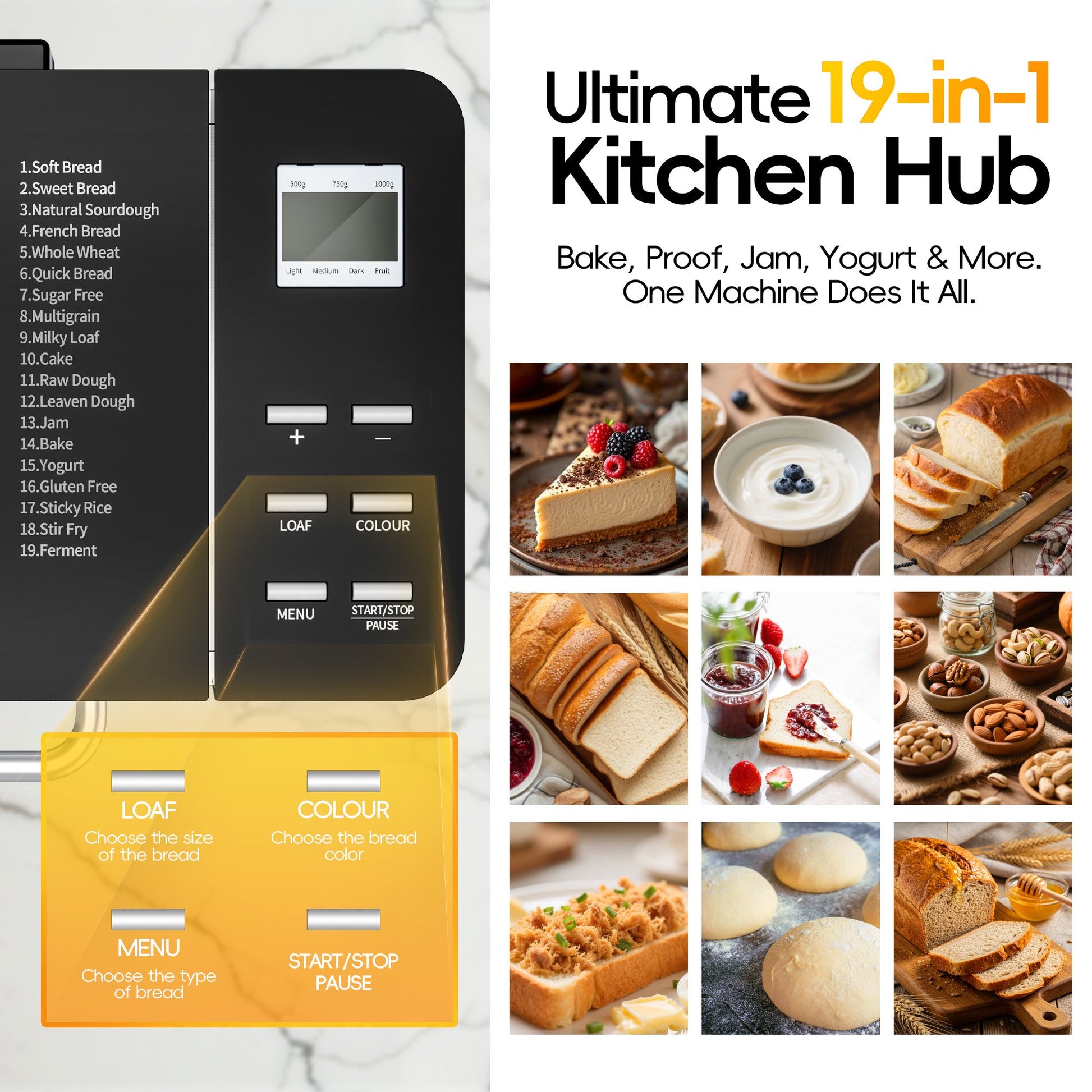 The Manastin automatic bread maker features 19 pre-programmed settings for baking cakes, whole wheat bread, jam, yogurt, gluten-free bread, and more. Its high-quality non-stick interior ensures easy cleaning, while the 720W powerful motor delivers exceptional kneading performance. With a 15-hour preset timer, you can enjoy freshly baked bread anytime. The machine also offers 1-hour automatic heat retention and a 15-minute memory function. Choose from three loaf sizes (1 lb / 1.5 lb / 2 lb) and three crust shades (light / medium / dark)—perfect for family meals or entertaining guests!