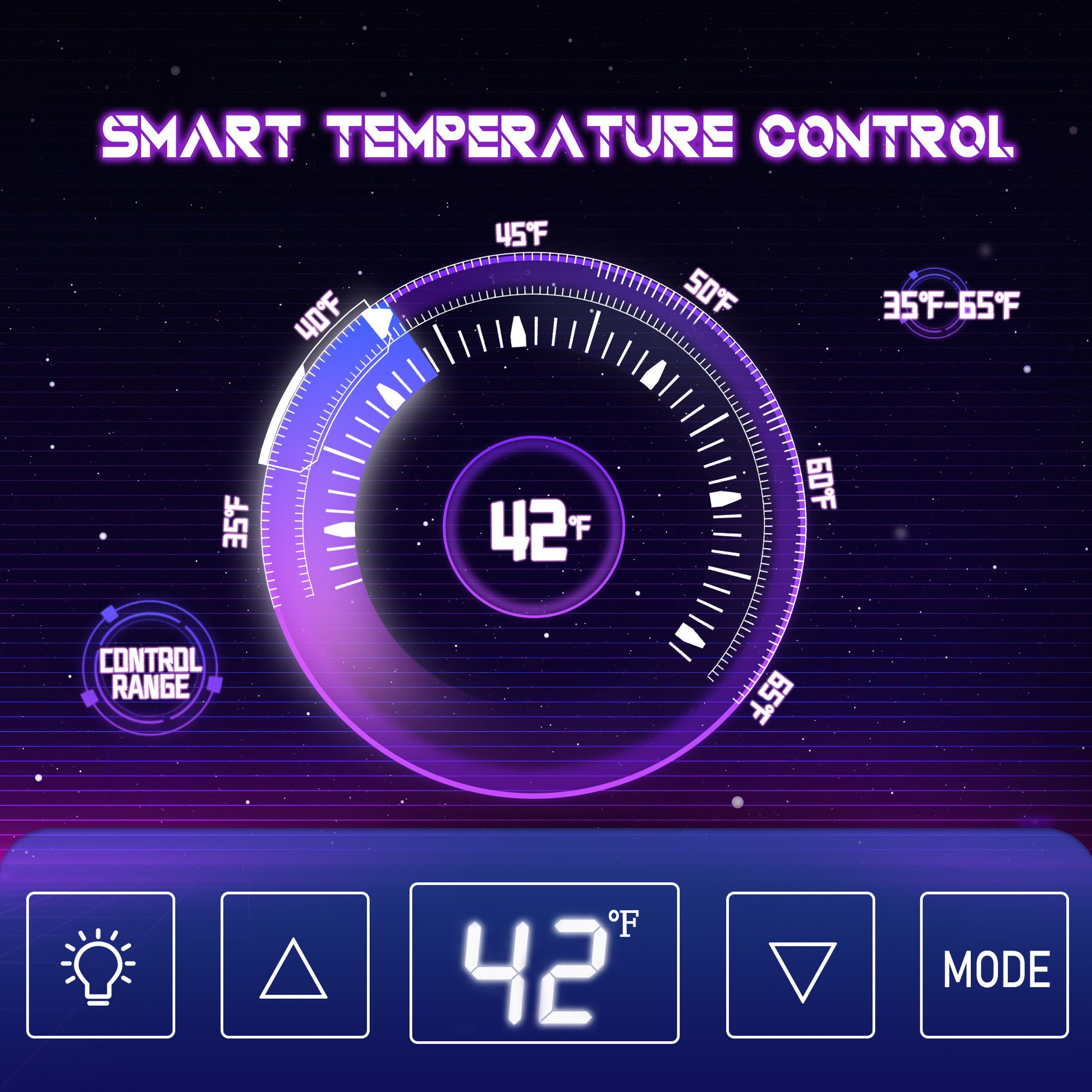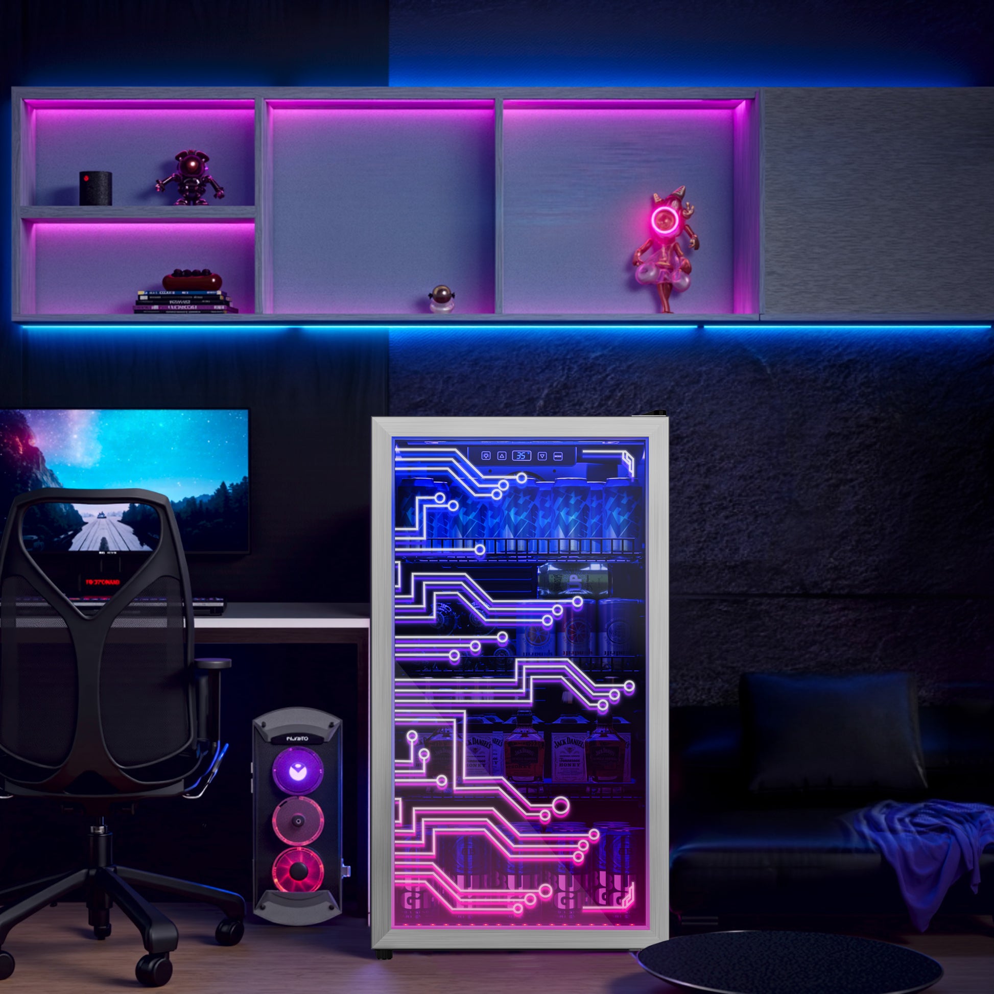 This illuminated beverage cooler is perfect for showcasing your favorite drinks with bright, energy-efficient LED lighting. It offers a generous 120-can capacity and features three adjustable, removable shelves, allowing you to customize storage for cans, bottles, or larger items. The temperature control system ensures your beverages stay at the ideal temperature, while the sleek, glass door provides a clear view of your collection. Designed as a freestanding mini fridge, it seamlessly fits into any home, office, or entertainment space. Enjoy convenient, stylish, and efficient beverage storage with this modern cooler.