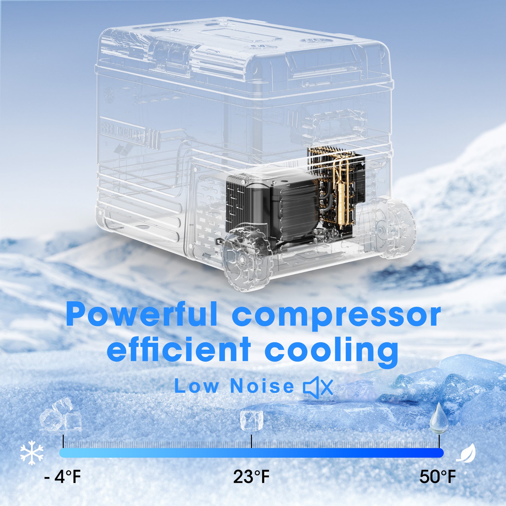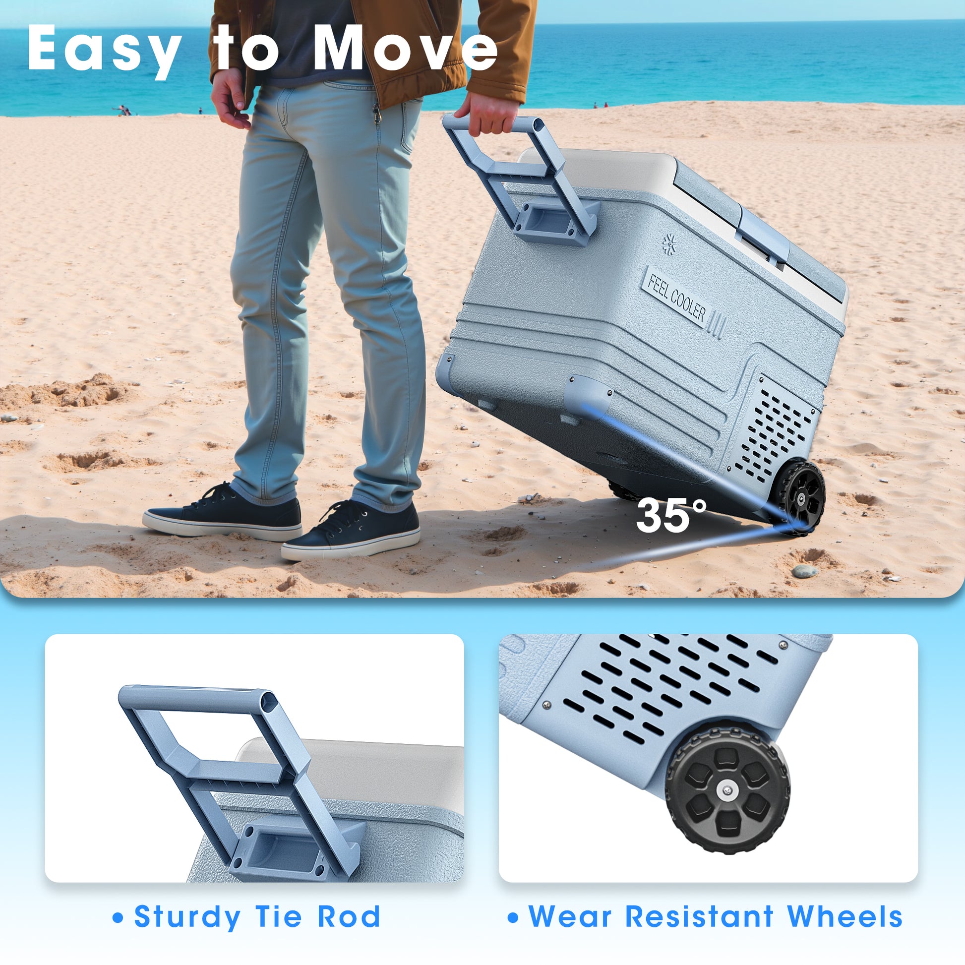 【Portable Design with Durable Wheels】Equipped with two sturdy wheels, this 37QT portable freezer is easy to transport, even when fully loaded. Whether you're moving it around your RV, truck, or campsite, the smooth-rolling wheels ensure hassle-free mobility on any adventure