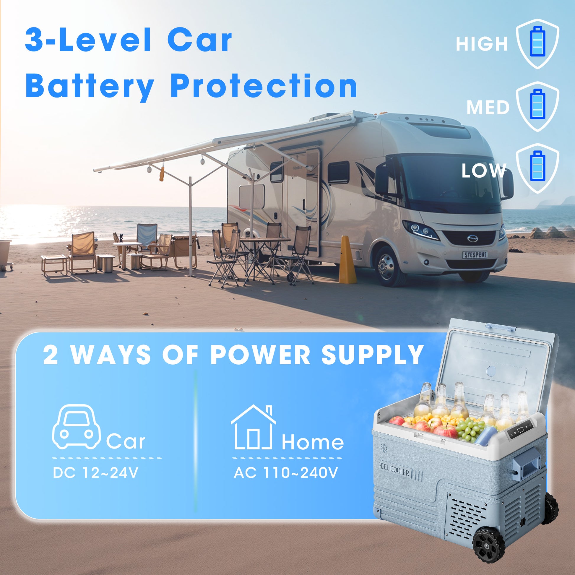 【Dual Power Options & Multiple Cooling Modes】This 12/24V DC and 110-240V AC car refrigerator comes with both home and vehicle power adapters. Choose between energy-saving or high-efficiency cooling modes, and rely on the built-in 3-level battery protection to safeguard your vehicle’s power supply.