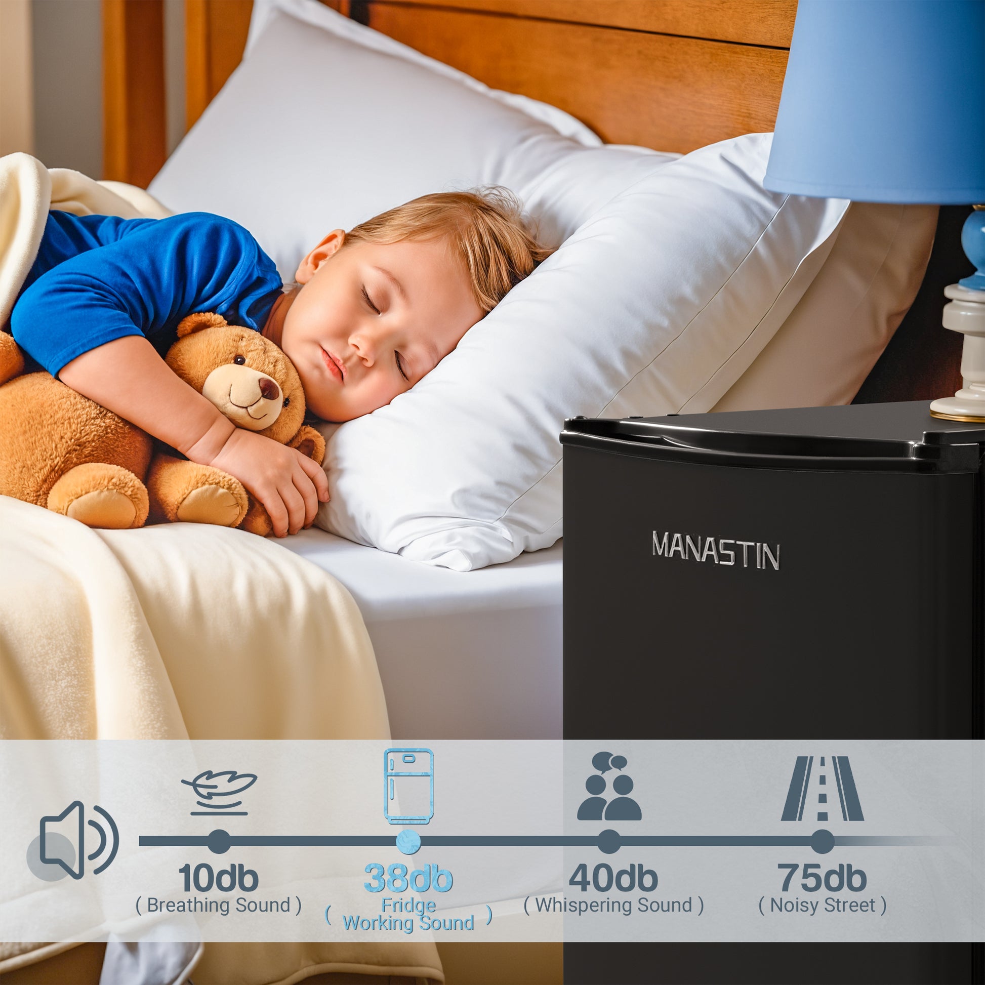 🔇【Quiet Operation & Easy Access】It operates with minimal noise and vibration, allowing you to confidently place this fridge next to your bed or desk. It won't disrupt your daily life or work, providing you with convenient accessibility.