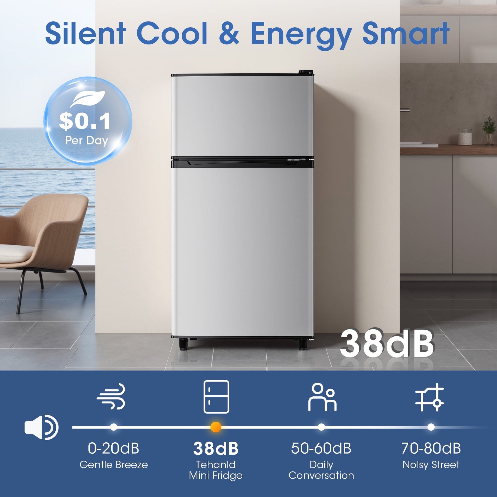 Manastin 3.5 Cu.ft Mini Fridge with Freezer, Adjustable Thermostat, Low Noise, Removable Glass Shelves, 2 Door Small Refrigerator for Kitchen, Office, Bedroom,Silver