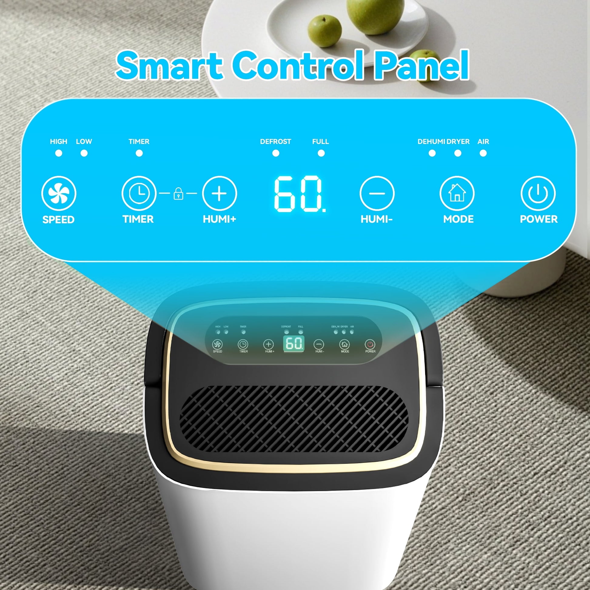 - 🌍[Smart Controls]: Intuitive buttons make it easy to adjust settings, select high/low speeds, set timers, activate dehumidification or dehumidification modes, and control humidity levels (HUMI+/HUMI-).