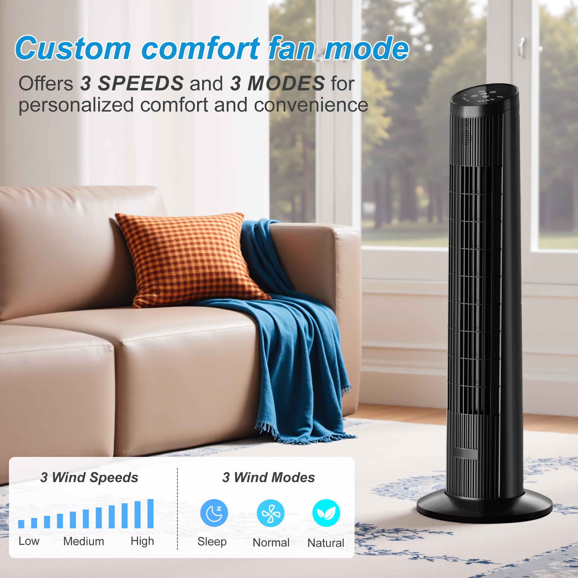 𝗙𝗿𝗲𝘀𝗵 𝗖𝗼𝗼𝗹𝗻𝗲𝘀𝘀: Our tower fan is light yet powerful, capable of swiftly stirring indoor air to bring a fresh breeze and comfortable coolness. Whether in the scorching summer or humid seasons, it is your loyal companion, crafting a pleasant environment for you.
