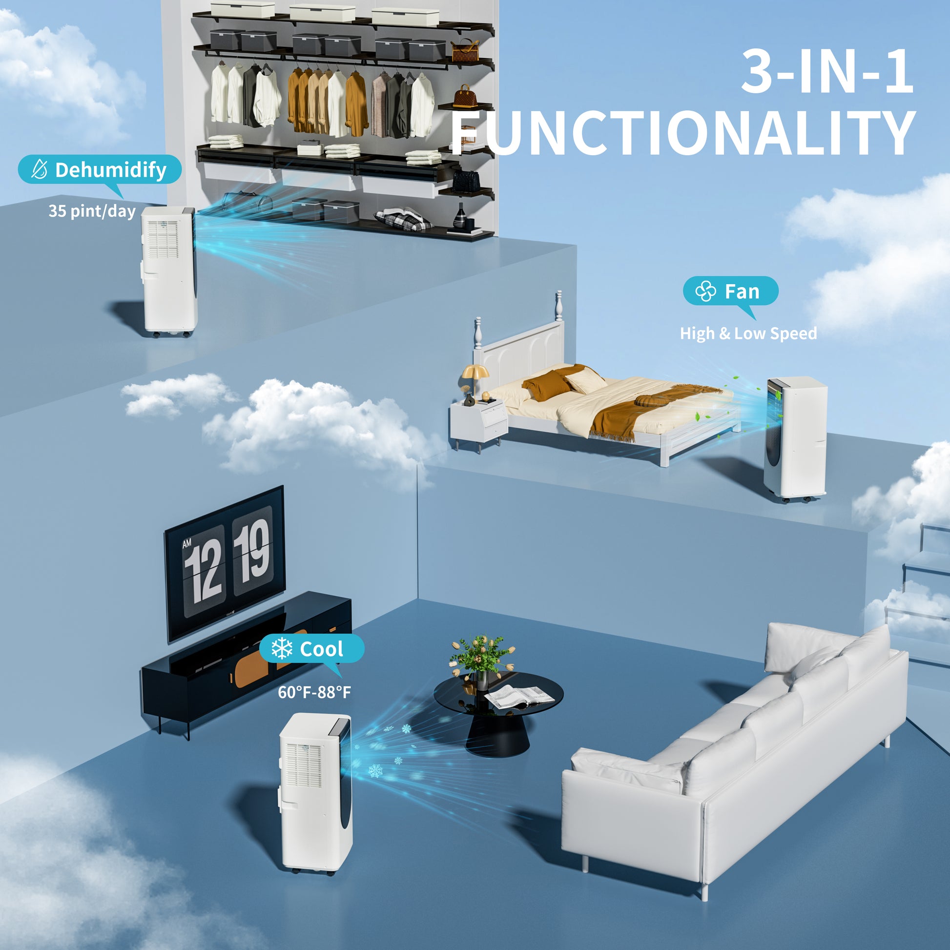 - 🍃【MORE THAN JUST PORTABLE】This powerful 3-in-1 unit meets your needs year-round. Besides its excellent cooling capacity (8000 BTU), it also effectively dehumidifies (35 pints/day) and features a fan function with low and high speeds. Whether dealing with summer heat or rainy season humidity, Manastin portable air conditioners alleviate hot, humid air problems and promote indoor air circulation, ensuring a refreshing and comfortable environment.