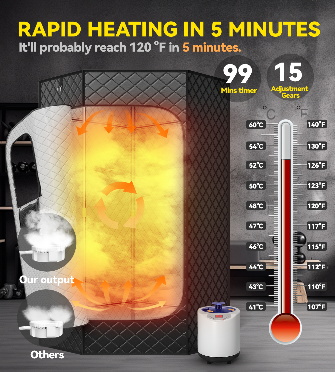 • ใ€๐Ÿญ๐Ÿฑ ๐—Ÿ๐—ฒ๐˜ƒ๐—ฒ๐—น๐˜€ ๐—ผ๐—ณ ๐—›๐—ฒ๐—ฎ๐˜๐—ถ๐—ป๐—ด ๐—ณ๐—ผ๐—ฟ ๐Ÿฑ ๐— ๐—ถ๐—ป๐˜‚๐˜๐—ฒ๐˜€ ๐—ช๐—ฎ๐—ฟ๐—บ-๐˜‚๐—ฝใ€‘Our sauna box features 15 temperature settings and a 99-minute timer, reaching a maximum temperature of 130ยฐF to 140ยฐF in no time. With a powerful 3L,1200W steam generator, it produces steam quickly, reducing preheat time. Compared to standard models, it offers a higher steam output, ensuring a comfortable and rejuvenating sauna experience.