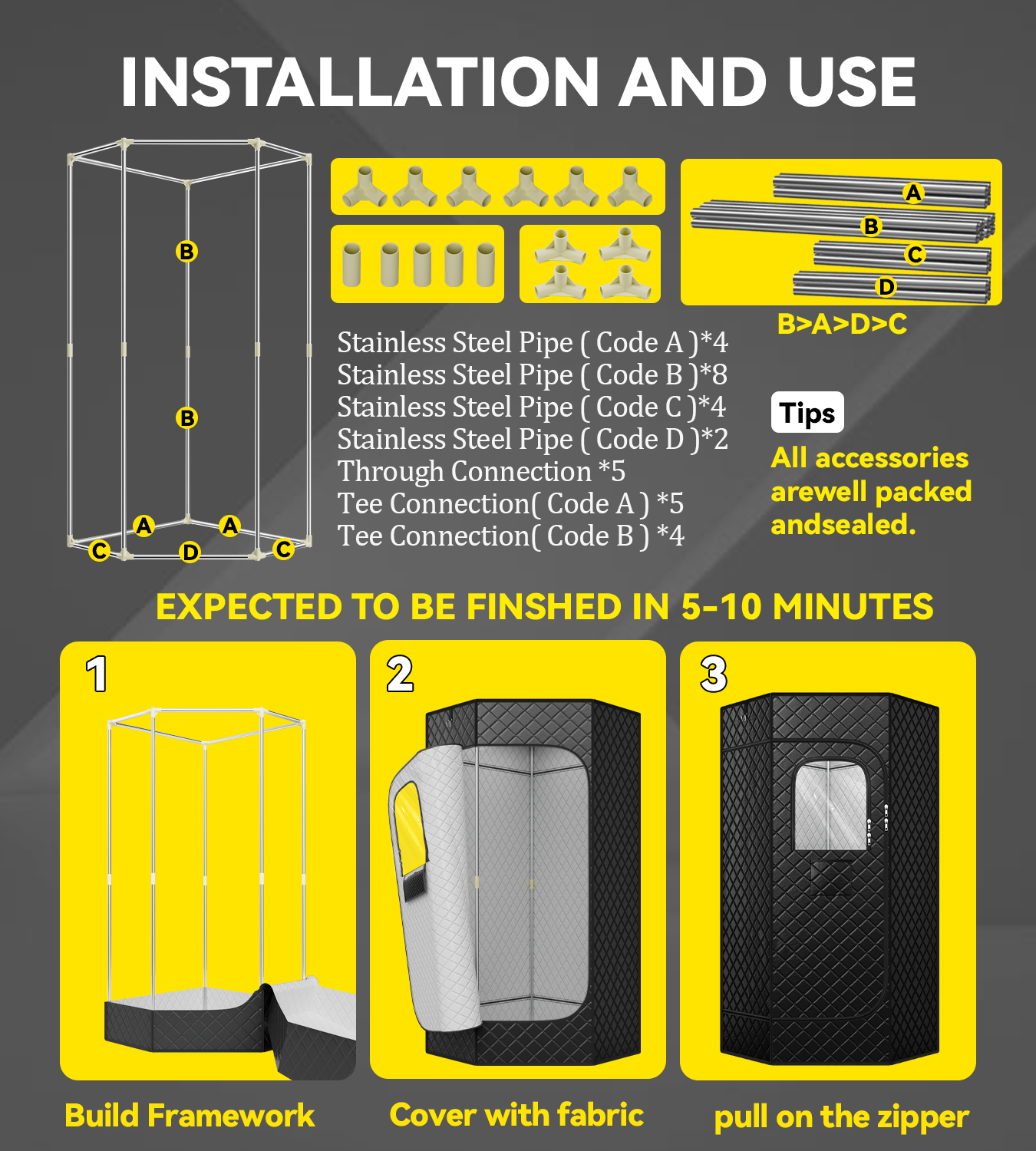 • ใ€๐—˜๐—ฎ๐˜€๐˜† ๐—œ๐—ป๐˜€๐˜๐—ฎ๐—น๐—น๐—ฎ๐˜๐—ถ๐—ผ๐—ป ๐—ฎ๐—ป๐—ฑ ๐—–๐—ฎ๐—ฟ๐—ฟ๐˜†ใ€‘ The included tools provide step-by-step instructions, making it as simple as 1-2-3 to assemble your sauna. We use only two types of steel pipes, eliminating the confusion of complicated pre-installation identification. The integrated double zipper design makes disassembly a breeze, so you can fold it up and take it with you wherever you go. With this portable sauna, you can enjoy a spa experience anytime, anywhere.