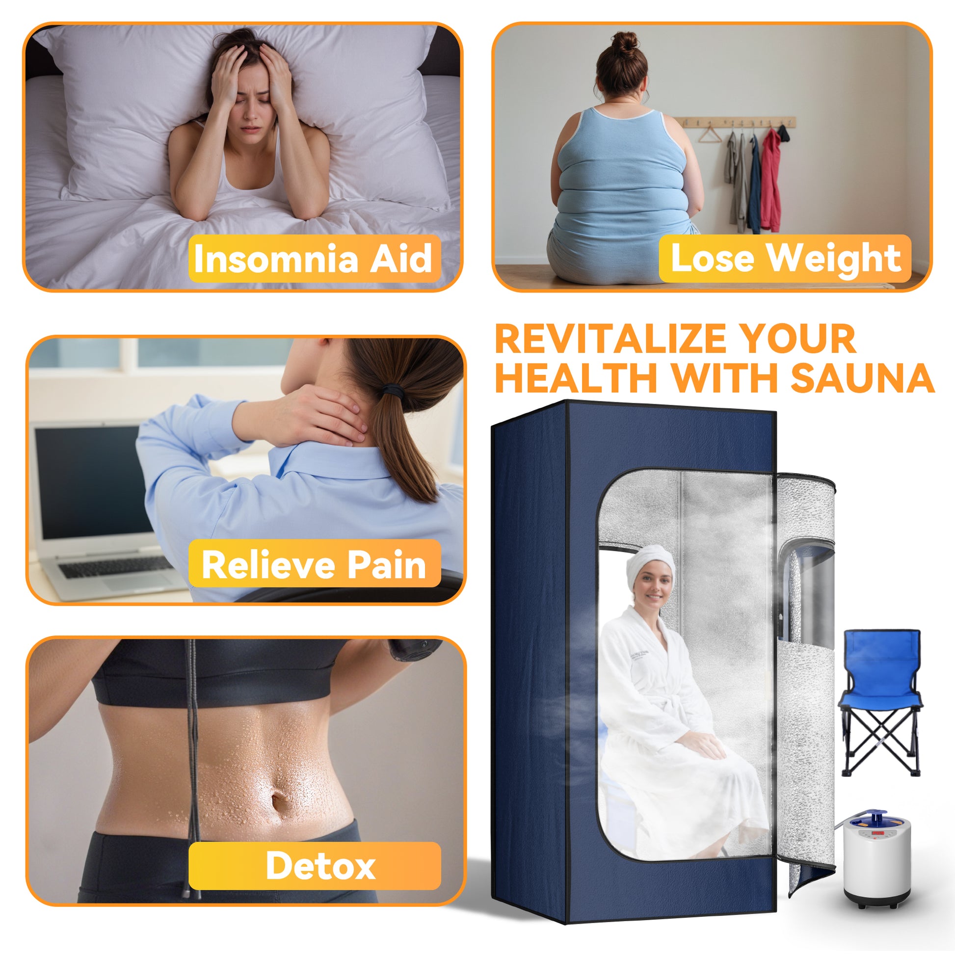 Portable Steam Sauna, 15 Levels of Foldable Sauna for Home, Sauna Box with 1200w 3L Steamer, Personal Sauna with Remote Control and Folding Chair, (Oxford Cloth, Navy Blue)