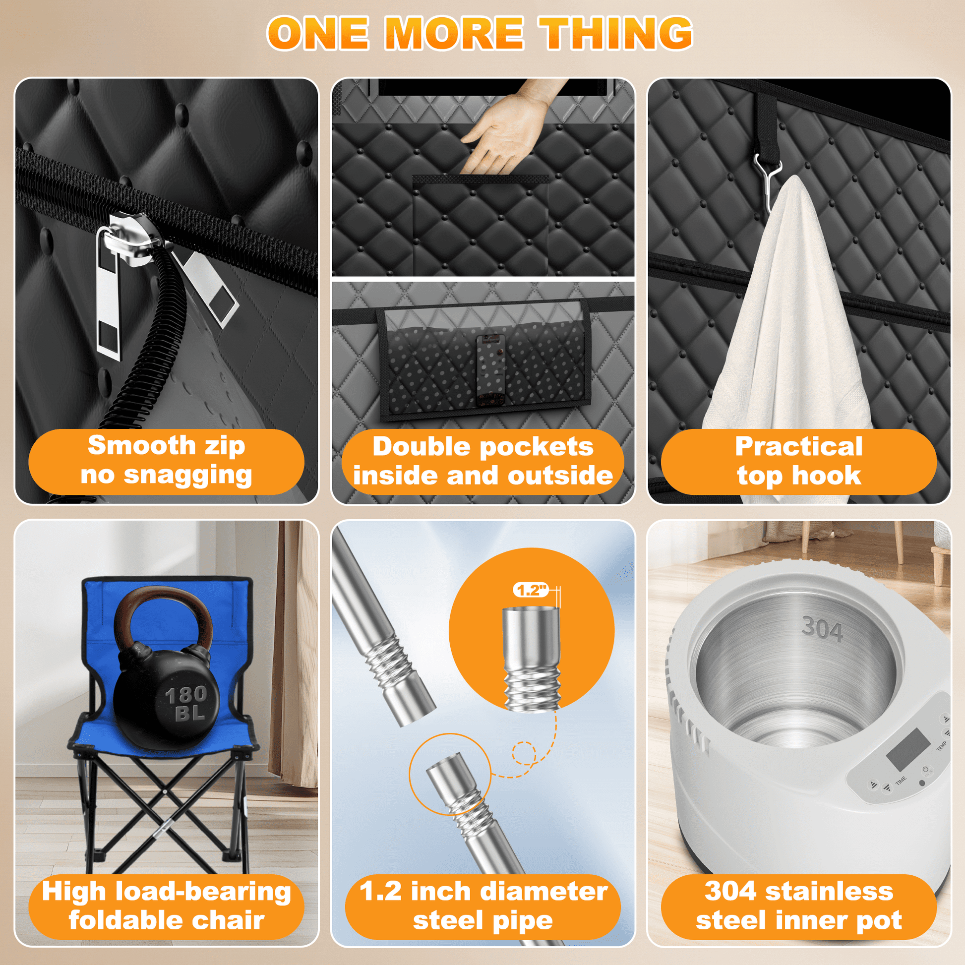 Manastin Satin All-Cotton Sauna is powered by a 1000-watt, 2.6-liter steam generator that heats up 20% faster and minimizes water replenishment. The spacious 70.9-inch x 30.7-inch x 30.7-inch interior ensures plenty of room for relaxation, the stainless steel boiler features dry heat and overflow protection, and the product is FCC/UL certified. While the premium satin cotton material is non-toxic, odorless and skin-friendly. Practical details such as smooth zippers, dual pockets, top hooks and a high-bearing folding chair (1.2-inch steel frame) also enhance ease of use. Perfect for home or private use, this sauna combines luxury, safety and durability.