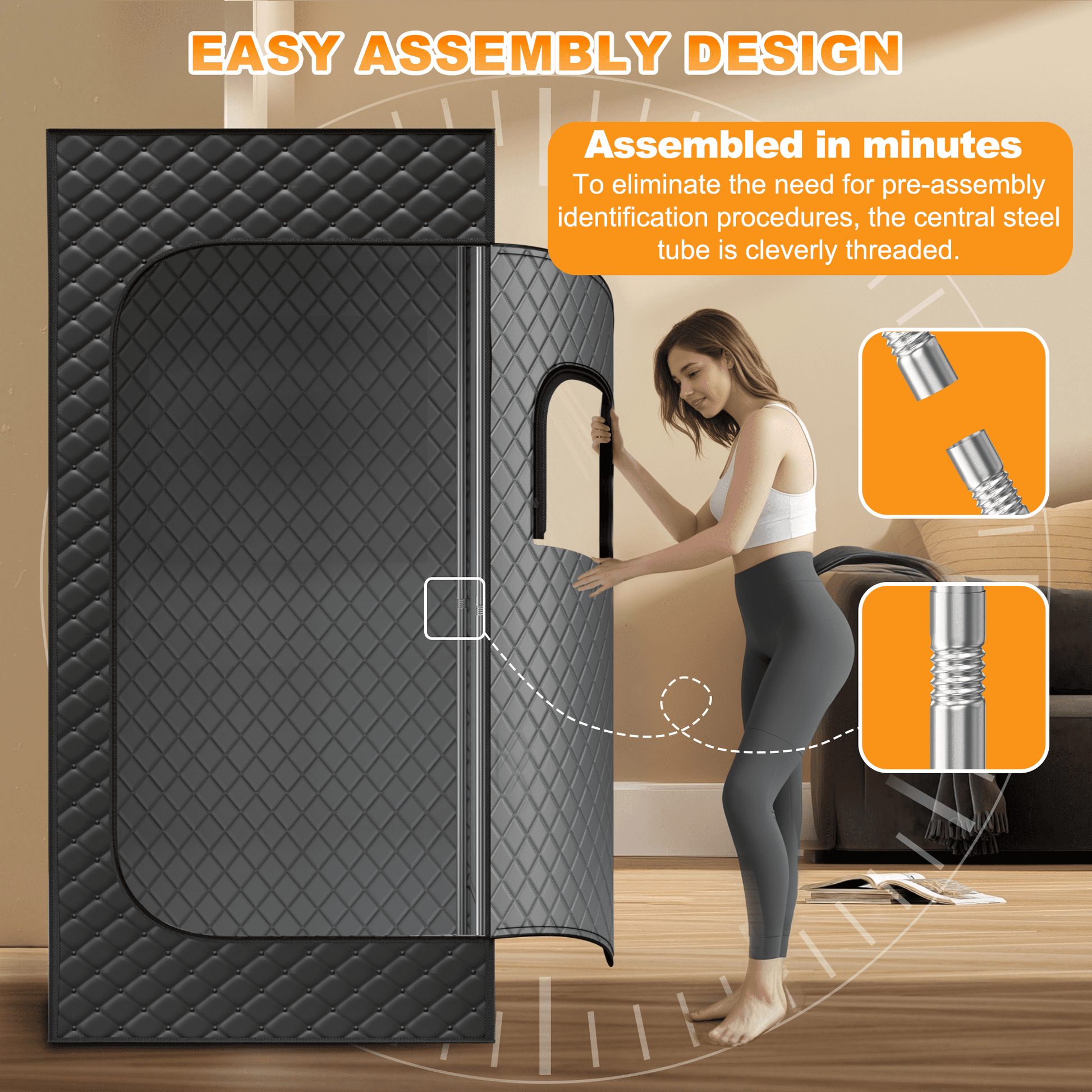 - 🔆[5-minute quick assembly ]: Our sauna room is made of durable 1.2-inch steel tubing, with a double zipper design for easy access, large ventilation windows, built-in pockets, and external hooks for towels/clothes. Simplified components and uniform connectors make assembly easy and simple, taking only a few minutes to set up.