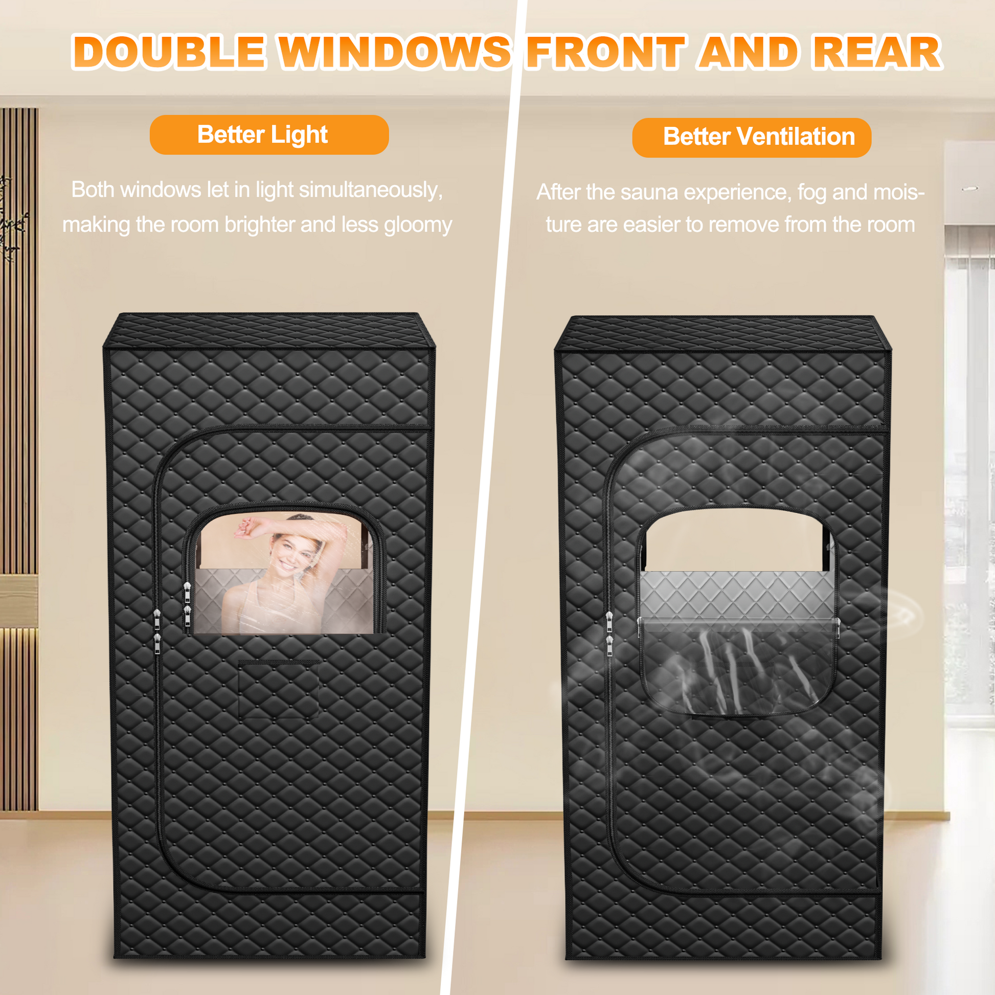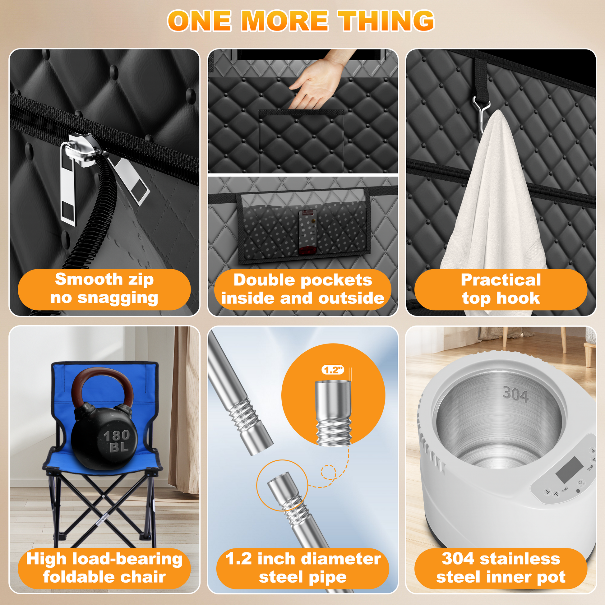 - ใ๐ด๐๐๐ ๐ป๐๐๐๐๐๐๐๐๐ ๐ซ๐๐๐๐๐๐ใ With dual windows at the front and back, you get more visibility and light while enjoying your sauna experience without feeling confined. There are inner and outer pockets for your phone or jewelry, a washable sweat-absorbent mat for hygiene, and hooks on the side for hanging clothes. We also provide a foldable chair with pockets for added functionality.