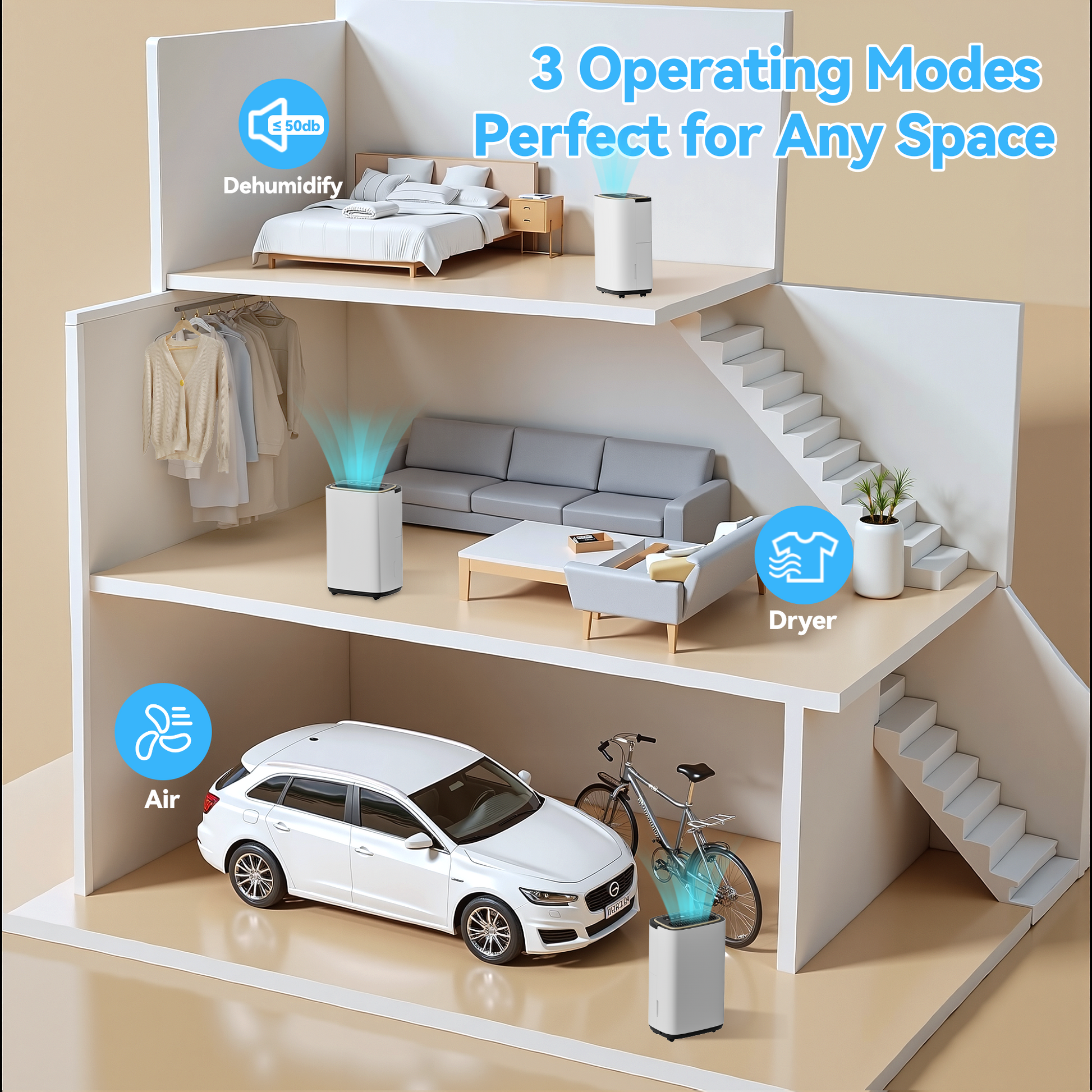 - 【3-in-1 Smart Dehumidification】 This advanced dehumidifier combines three powerful modes into one compact unit: In Dehumidify Mode, precisely adjust humidity levels between 30%-80% RH for customized comfort; switch to Dry Clothes Mode for automatic high-speed airflow (fixed humidity setting) to accelerate laundry drying; or use Fan Mode for pure air circulation without water collection.
