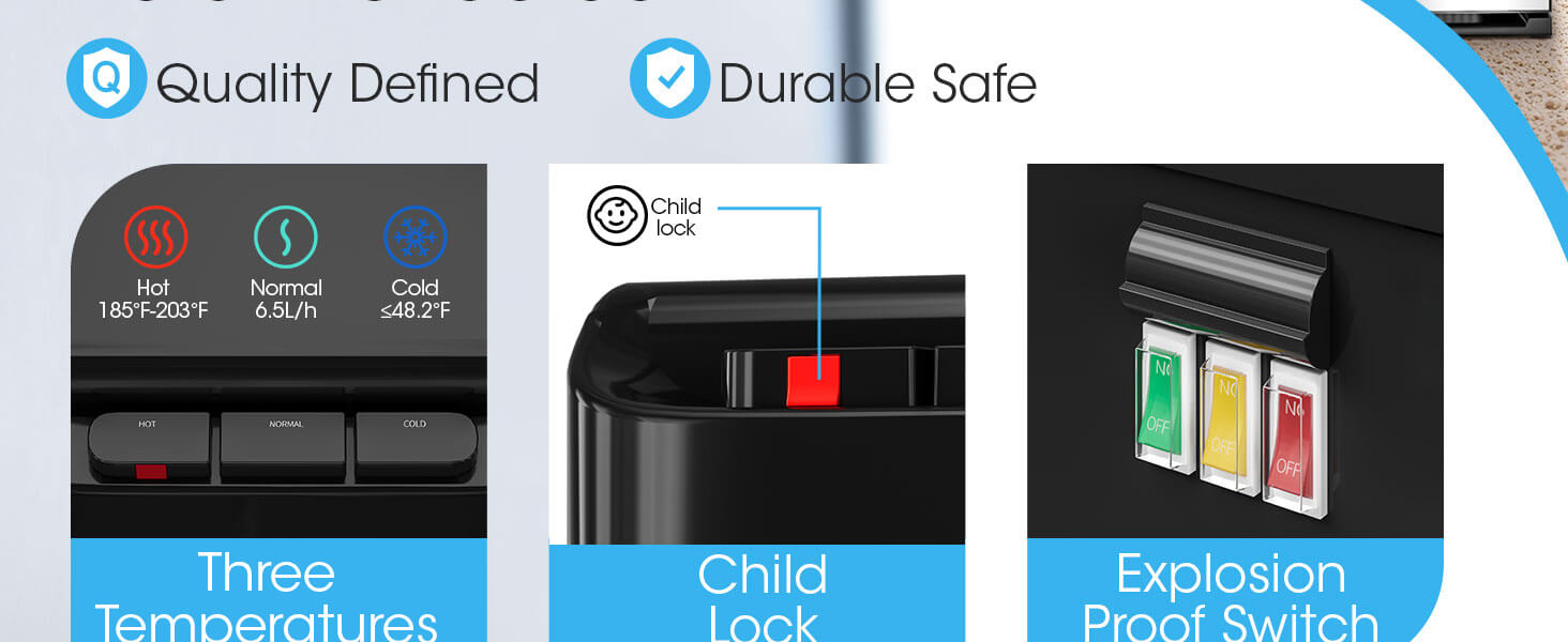 - Child-Safe Hot Water Lock: A secure two-step safety lock on the hot water tap prevents accidental scalding.