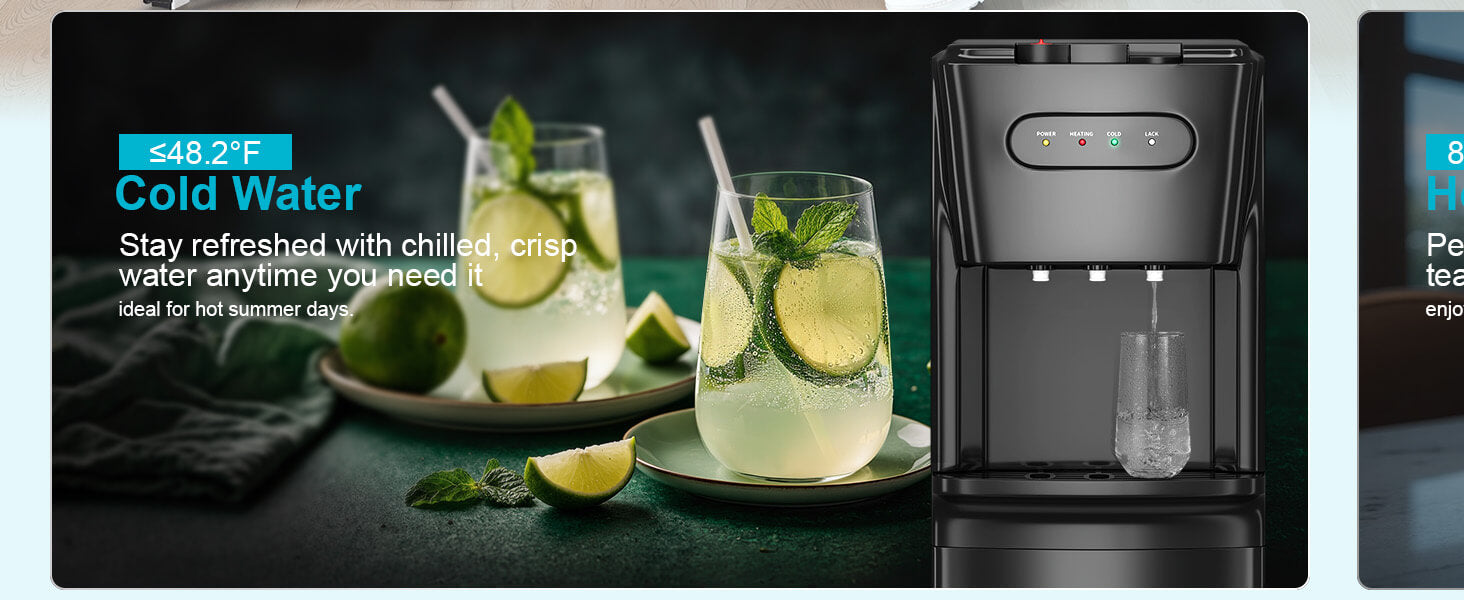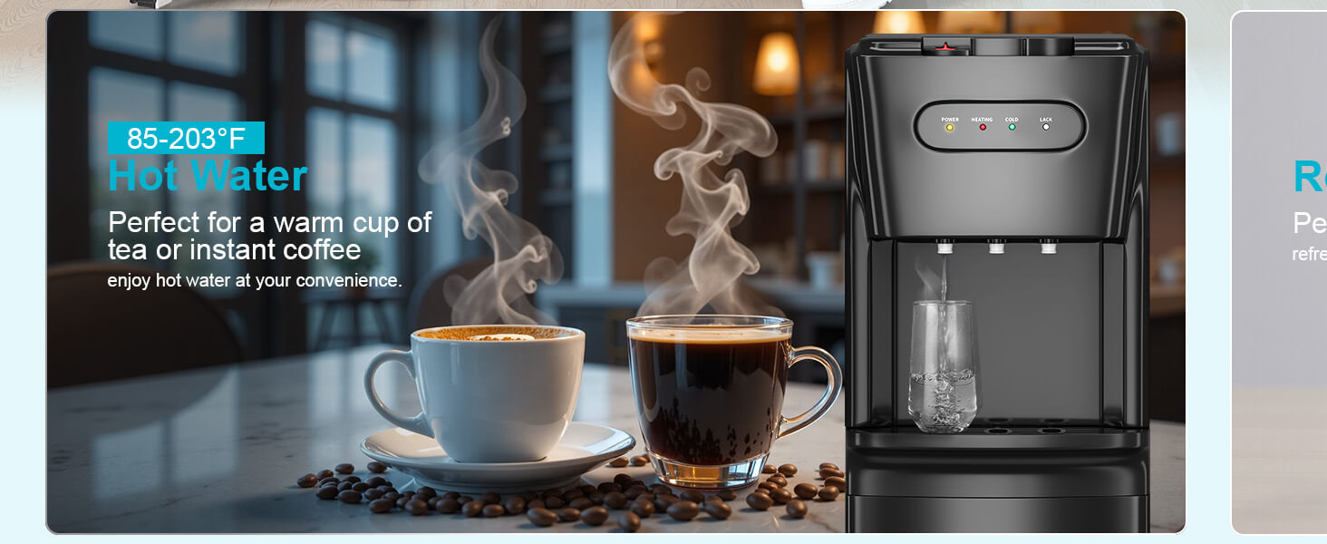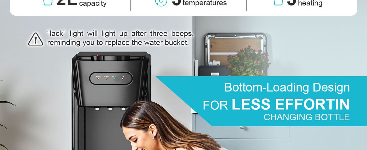 - Easy Bottom-Loading Design: Enables effortless bottle replacement with a sleek, space-saving hidden compartment for 3/5-gallon bottles.