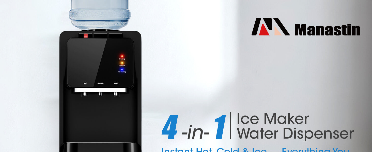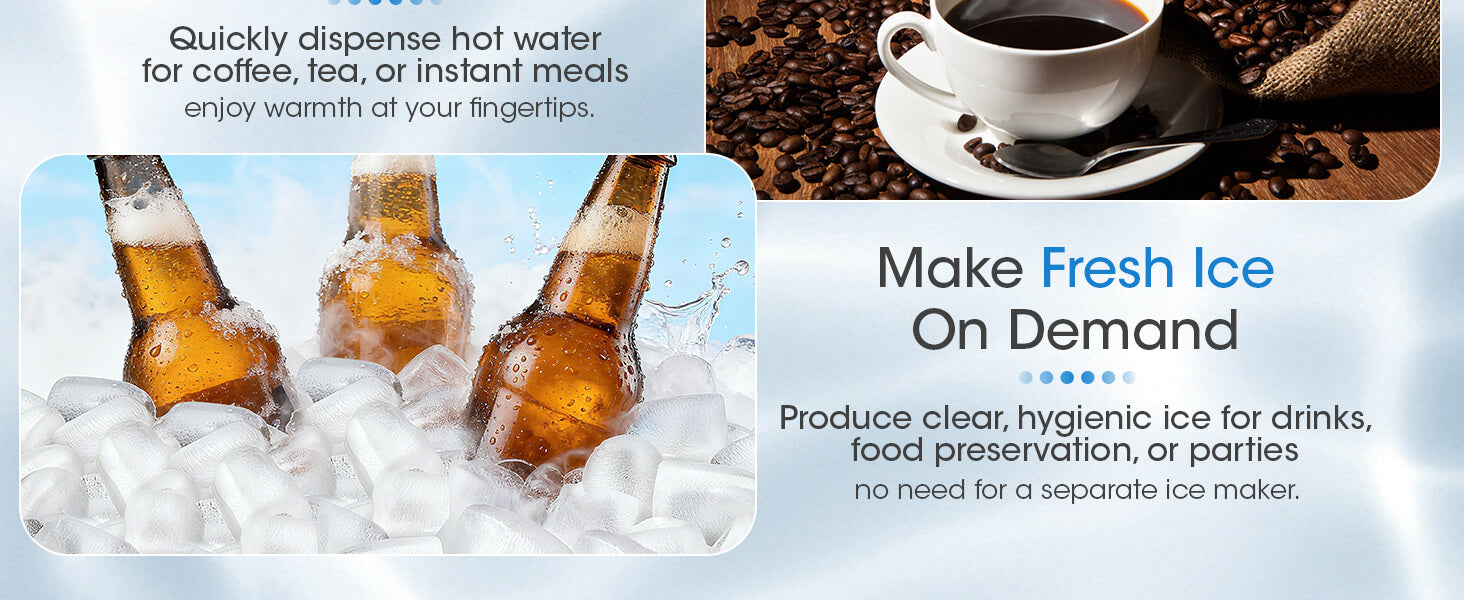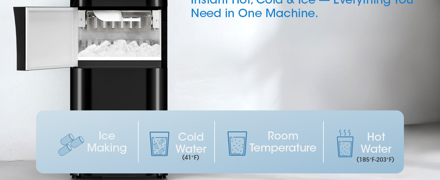 - 4-in-1 Multifunctional Appliance: Enjoy hot, cold, and room-temperature water plus fresh ice, all from one sleek, space-saving unit.