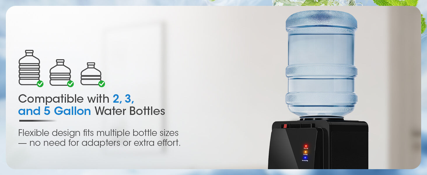 - Sleek, Versatile Design: Its compact design fits any space and works with standard 2, 3, and 5-gallon water bottles.