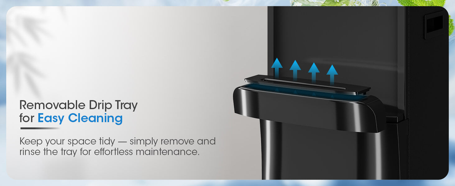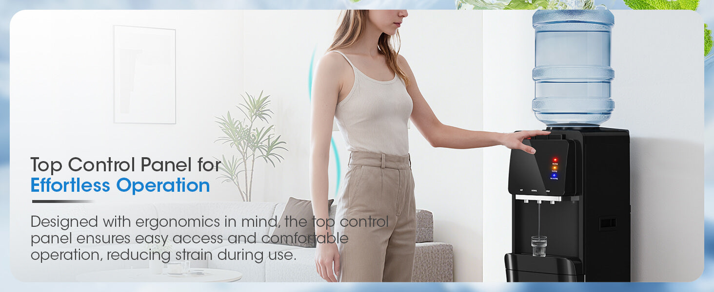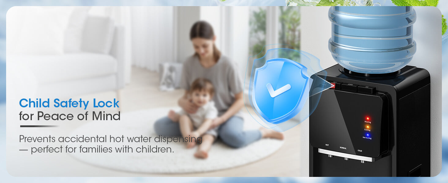 - Child Safety Lock & Top Controls: Features a child safety lock on the hot water and an easy-to-use top-mounted control panel.